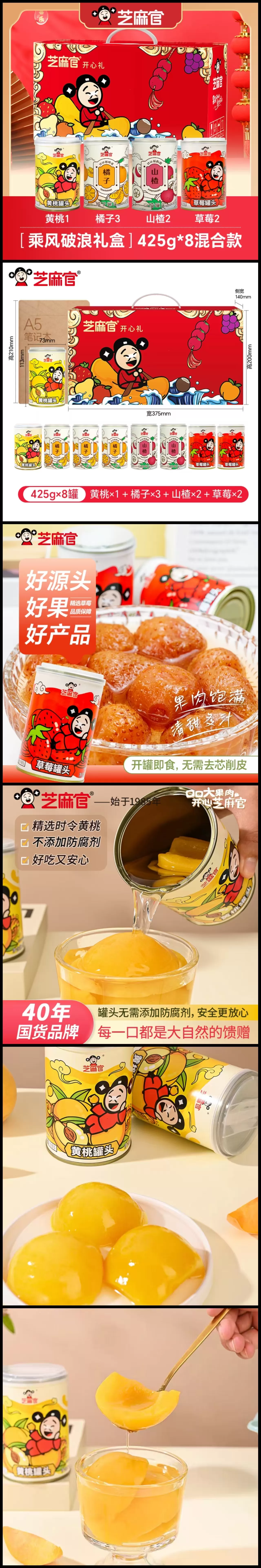 这款40 年老国货芝麻官水果罐头礼盒,是集黄桃、橘子、山楂、草莓于一体的混合款零食,无需开罐去芯削皮,开罐即食,清甜多汁,既是日常解馋零食,也是节日送礼的优质选择。