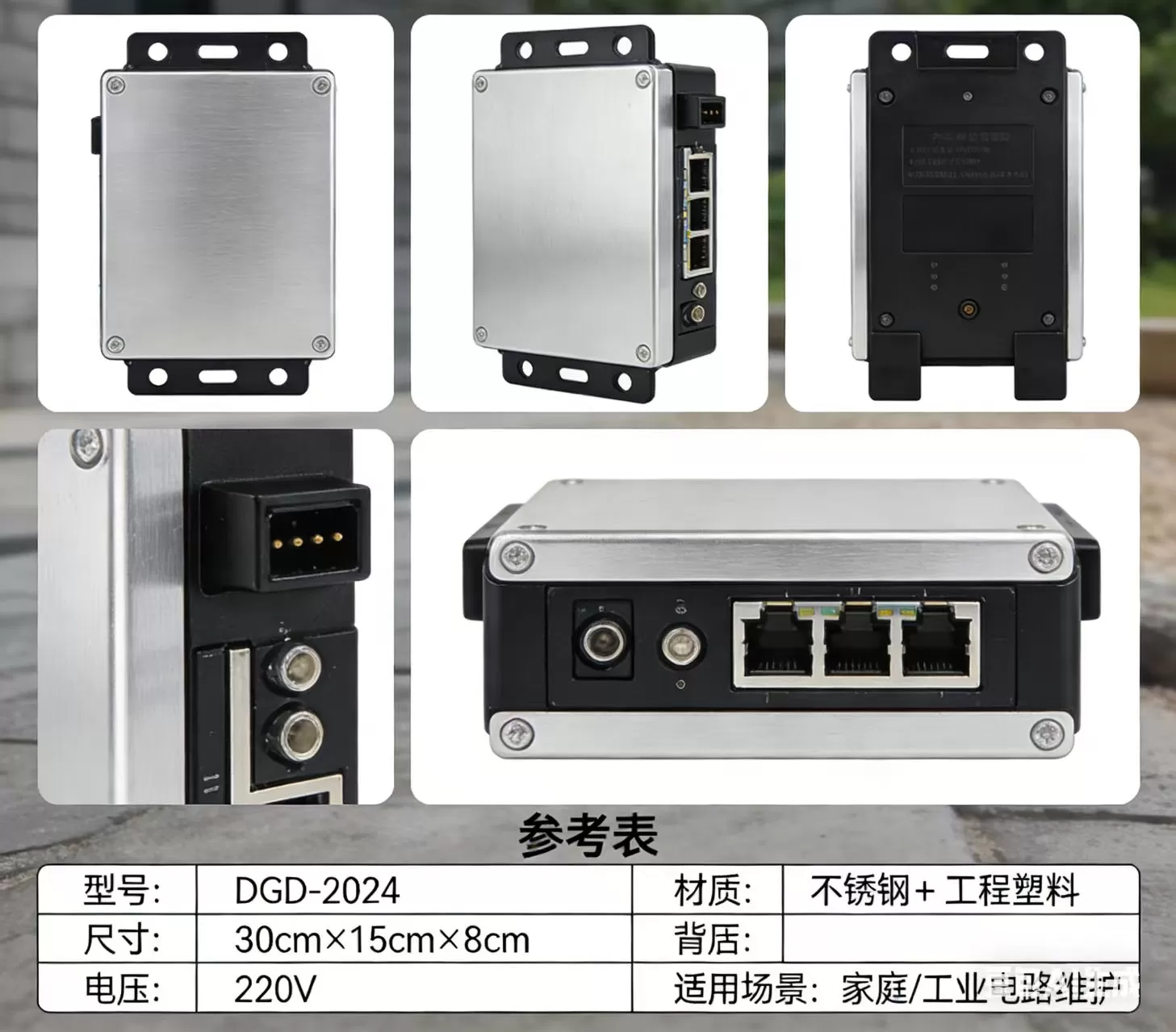 这是一款不锈钢 + 工程塑料材质的工业级网络网关 / 数据采集终端,适配 220V 供电,用于工业 / 家庭电路维护、数据传输与远程监控,是工业物联网 (IIoT) 场景的核心边缘设备。