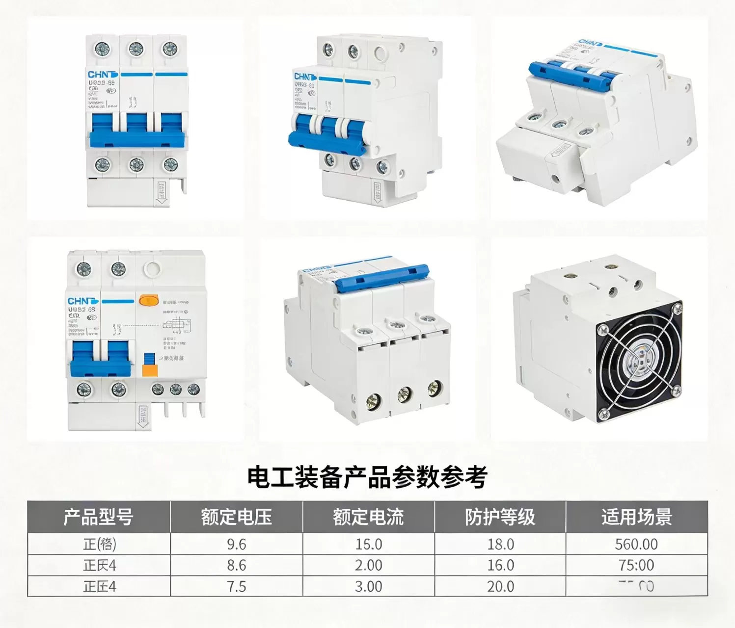 这是一组低压配电终端产品,包含小型断路器(空开)和带散热辅助的漏电保护开关,主要用于家庭、工商业的电路过载、短路及漏电保护,是电工装备的核心组成部分。