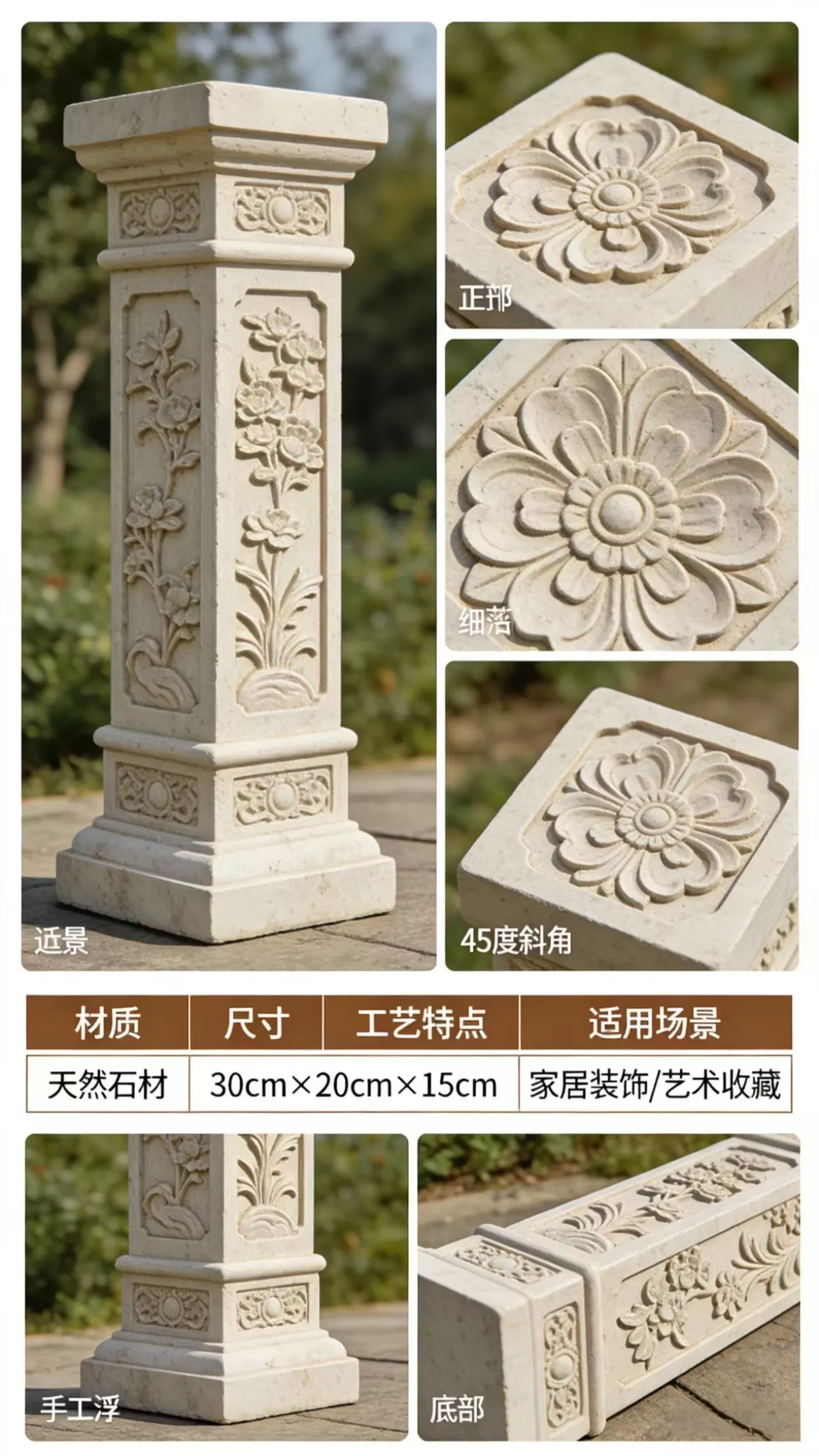 | 材质 | 天然石材(米白 / 浅黄系石材,质地坚硬、耐风化、耐腐蚀) |