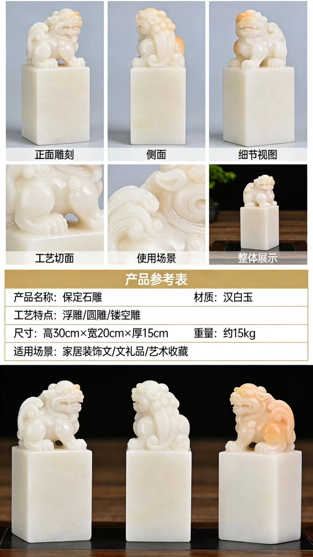 这是保定石雕出品的汉白玉瑞兽钮印章,是中式文房、家居装饰的经典吉祥摆件,兼具艺术收藏与文化礼品属性。