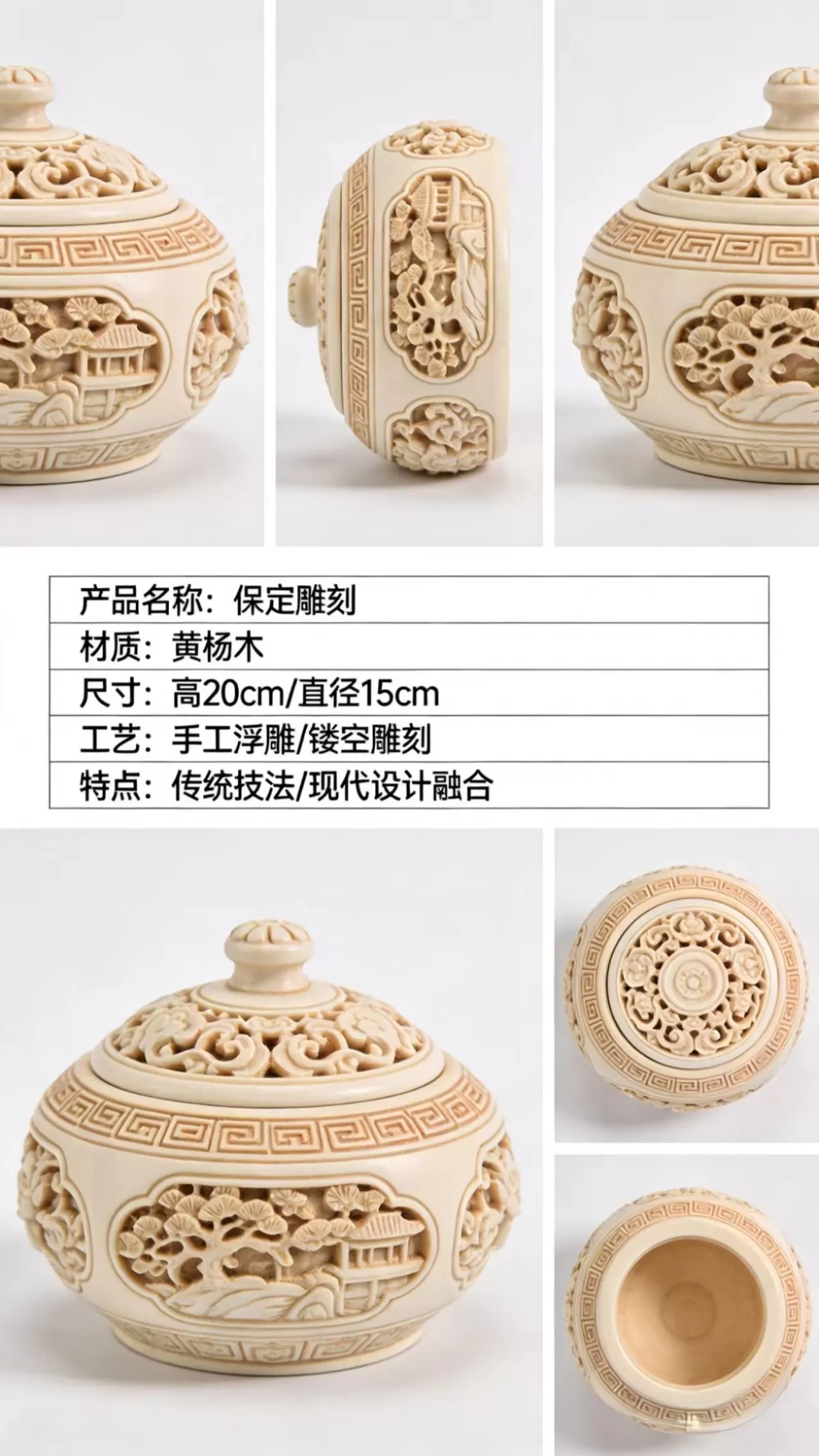 | 工艺 | 手工浮雕 + 镂空雕刻(非遗传统木雕工艺) |