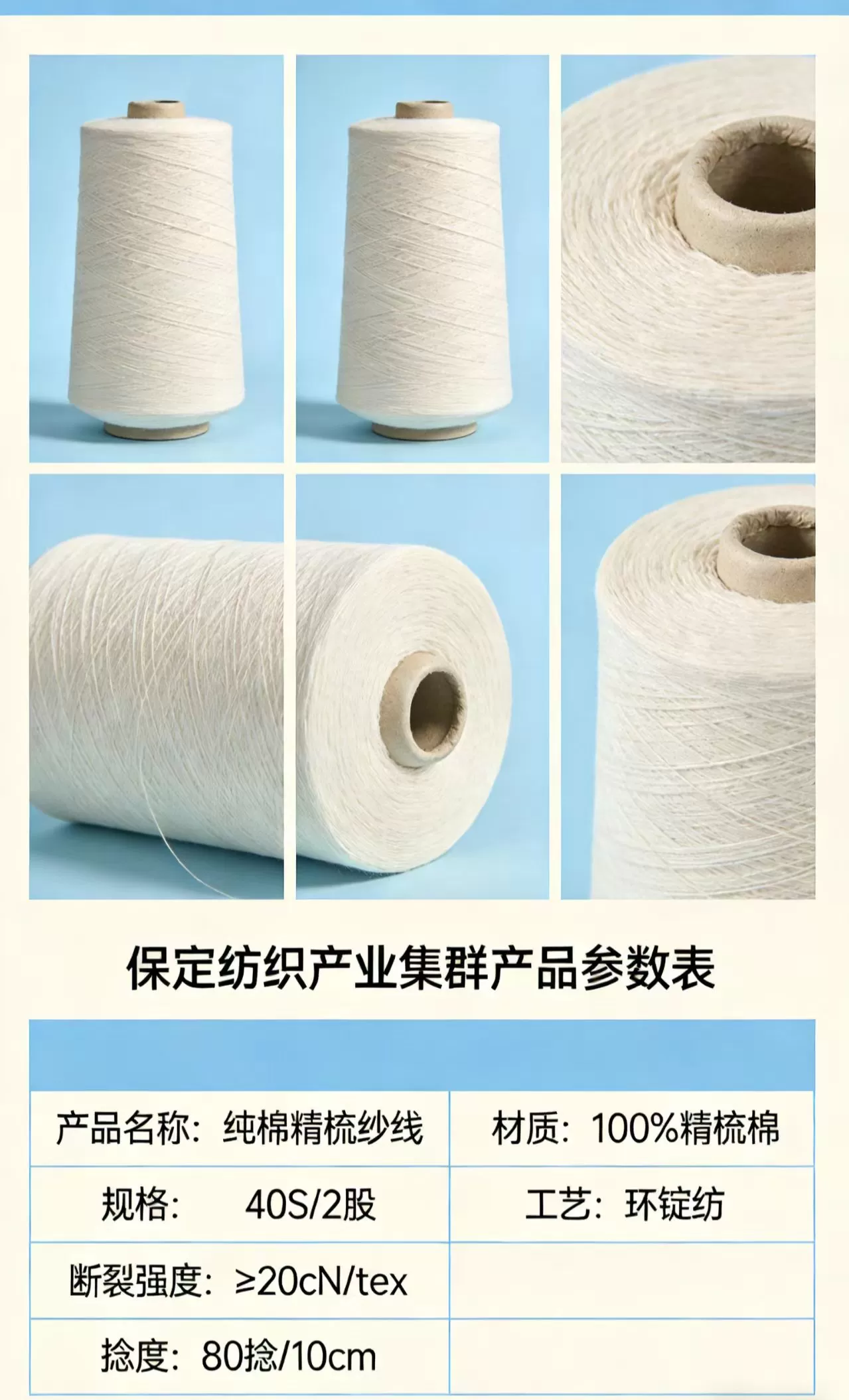 这是保定纺织产业集群出品的高端针织用纱,主打的是100% 精梳棉材质,采用环锭纺工艺生产,是织造高品质针织面料、缝纫线的核心原料。