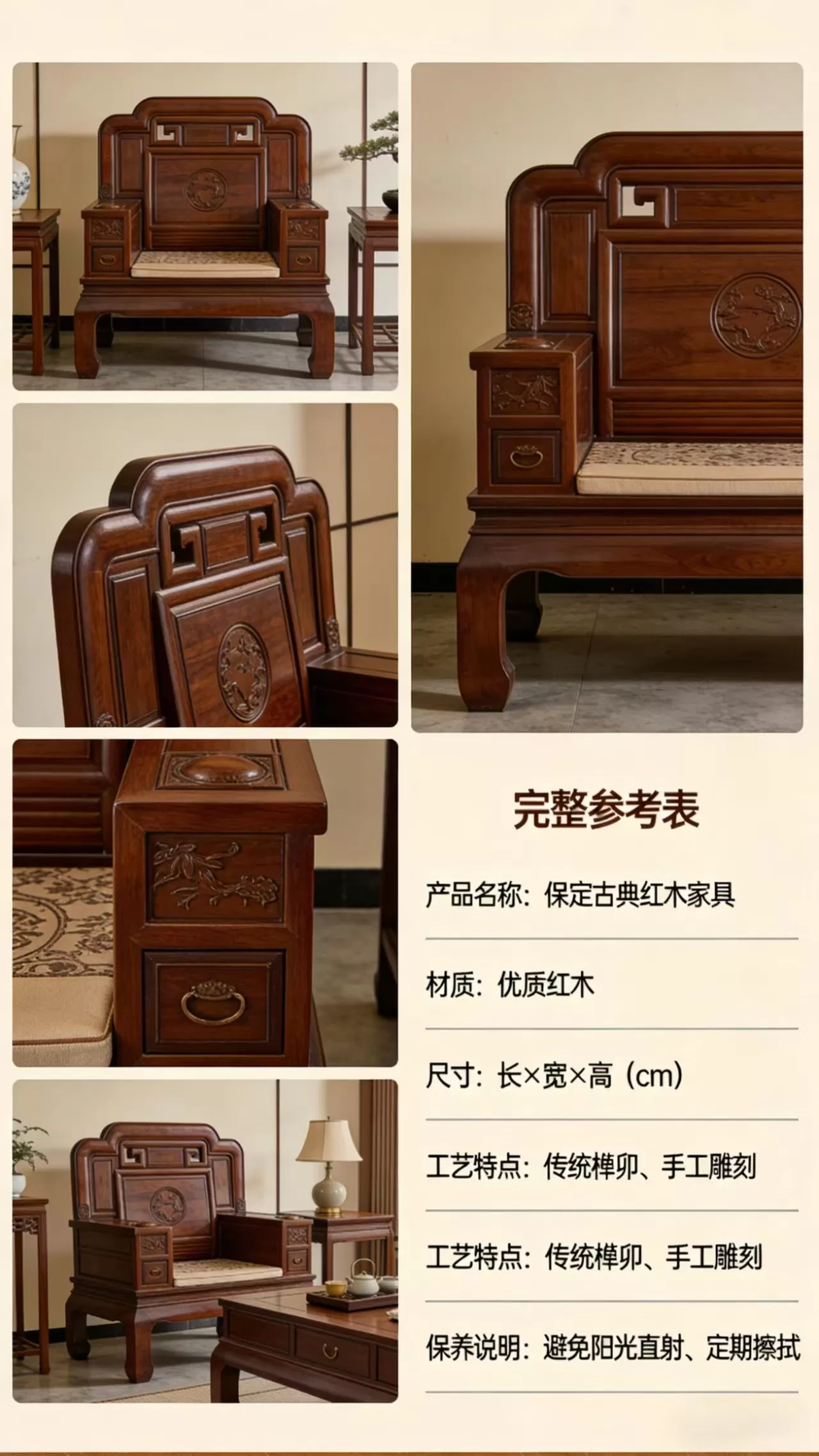 | 工艺特点 | 传统榫卯结构、手工雕刻 |