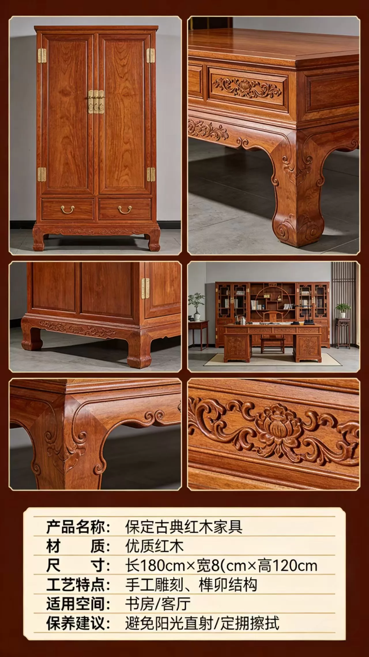 这是保定古典红木家具产业集群出品的中式古典实木衣柜 / 书桌系列,采用优质红木材质、手工雕刻 + 榫卯结构,是书房、客厅的高端实木家具。