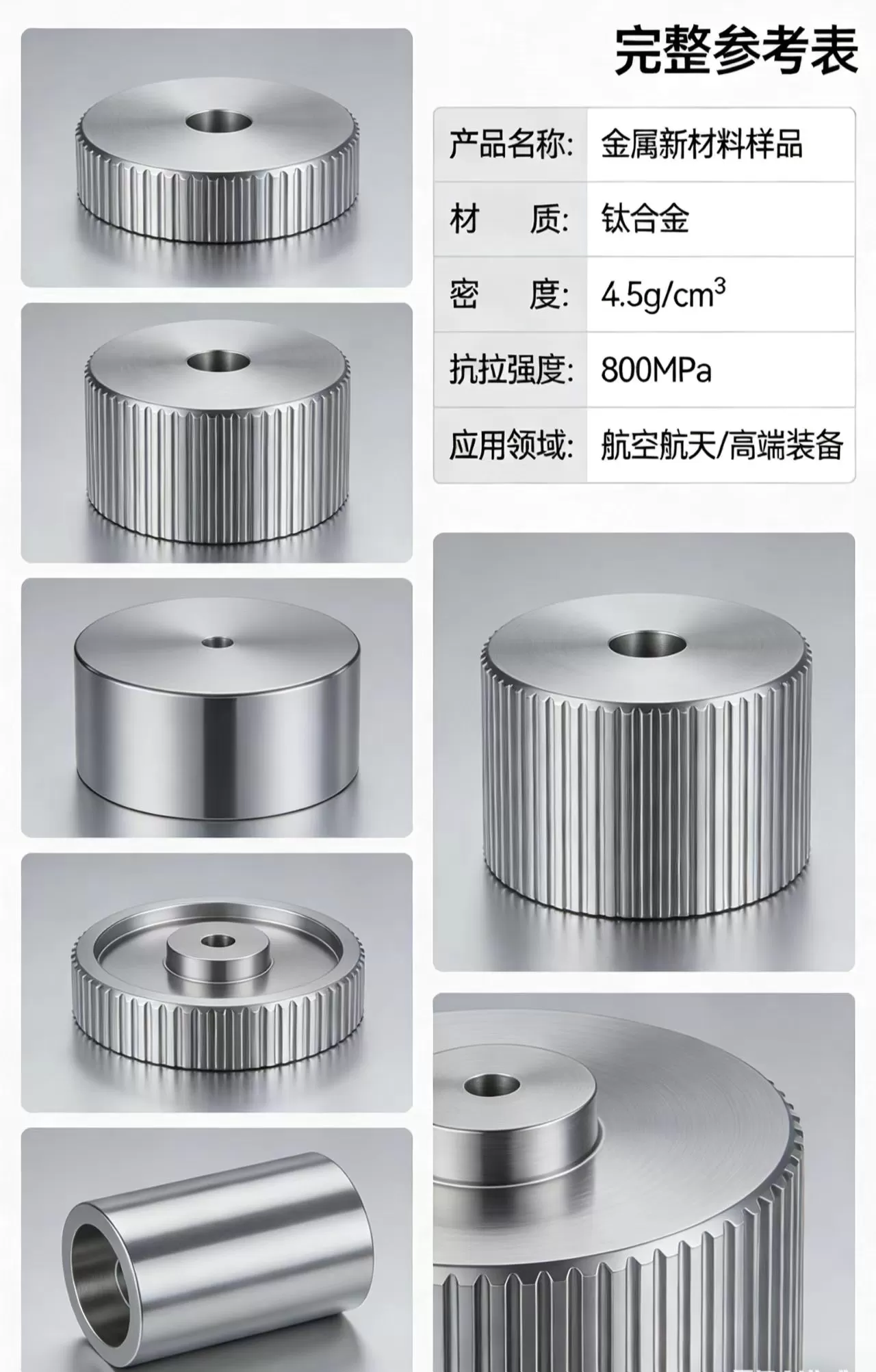 这是一款钛合金材质的金属新材料精密结构件(含齿轮 / 轴套 / 圆柱等多规格),核心性能优异,是航空航天、高端装备领域的高端轻量化材料。