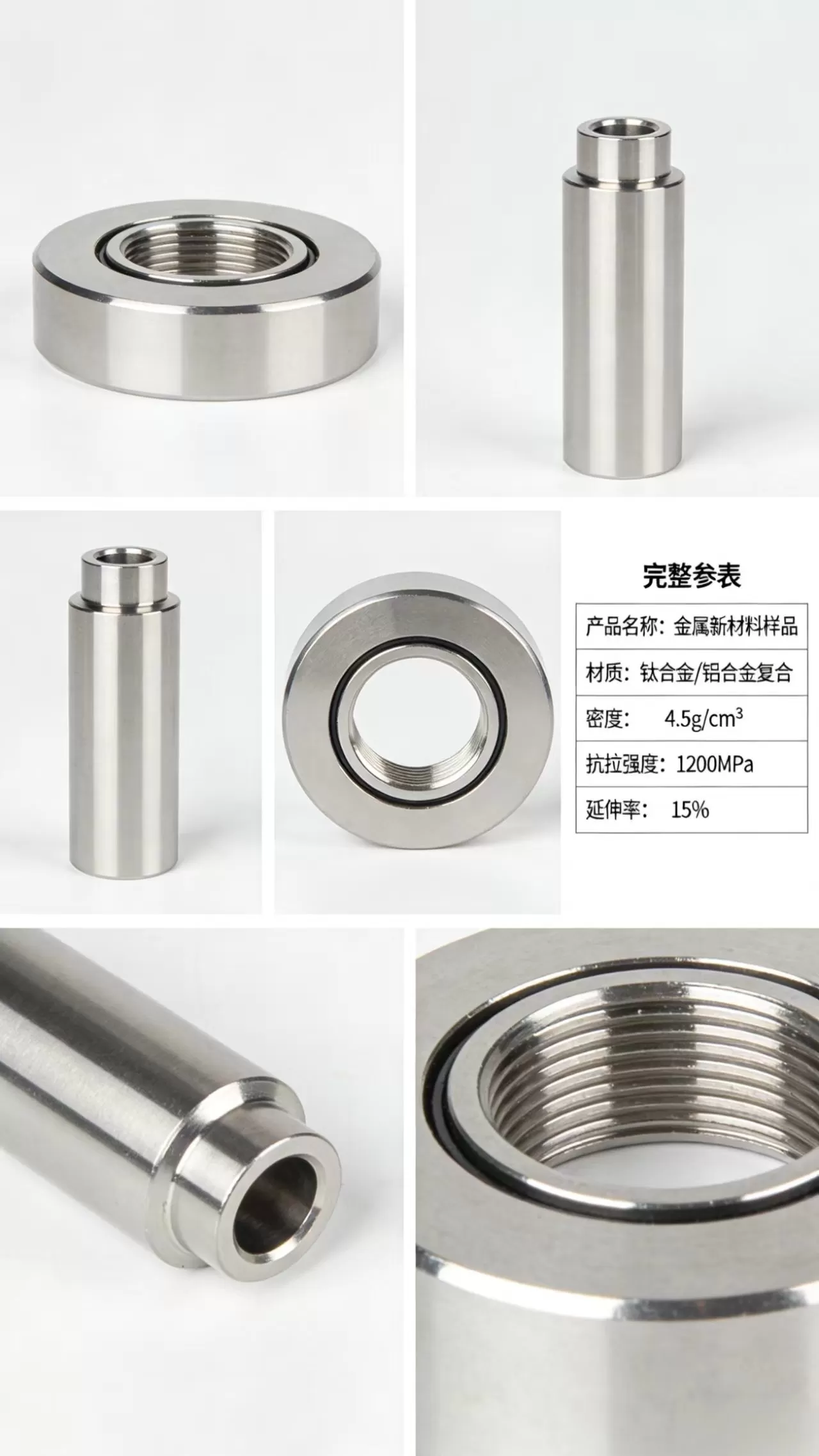 这是一款钛合金 / 铝合金复合材质的金属新材料精密连接件,包含阶梯轴、螺纹法兰盘等结构,集高强度、轻量化、高韧性于一体,是航空航天、高端装备领域的核心精密零件。