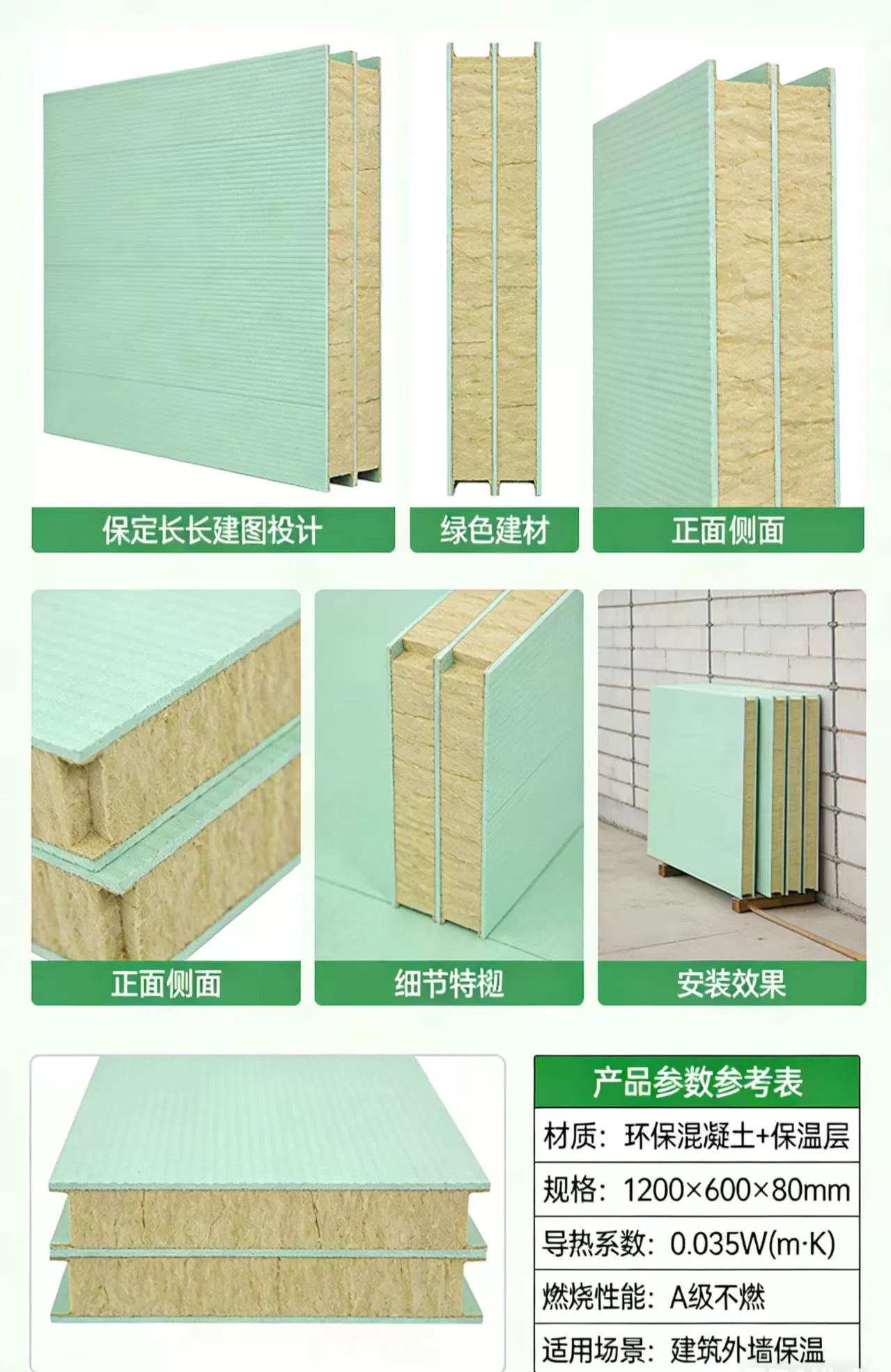 | 材质结构 | 环保混凝土面板 + 保温芯层(岩棉 / 挤塑板等) |