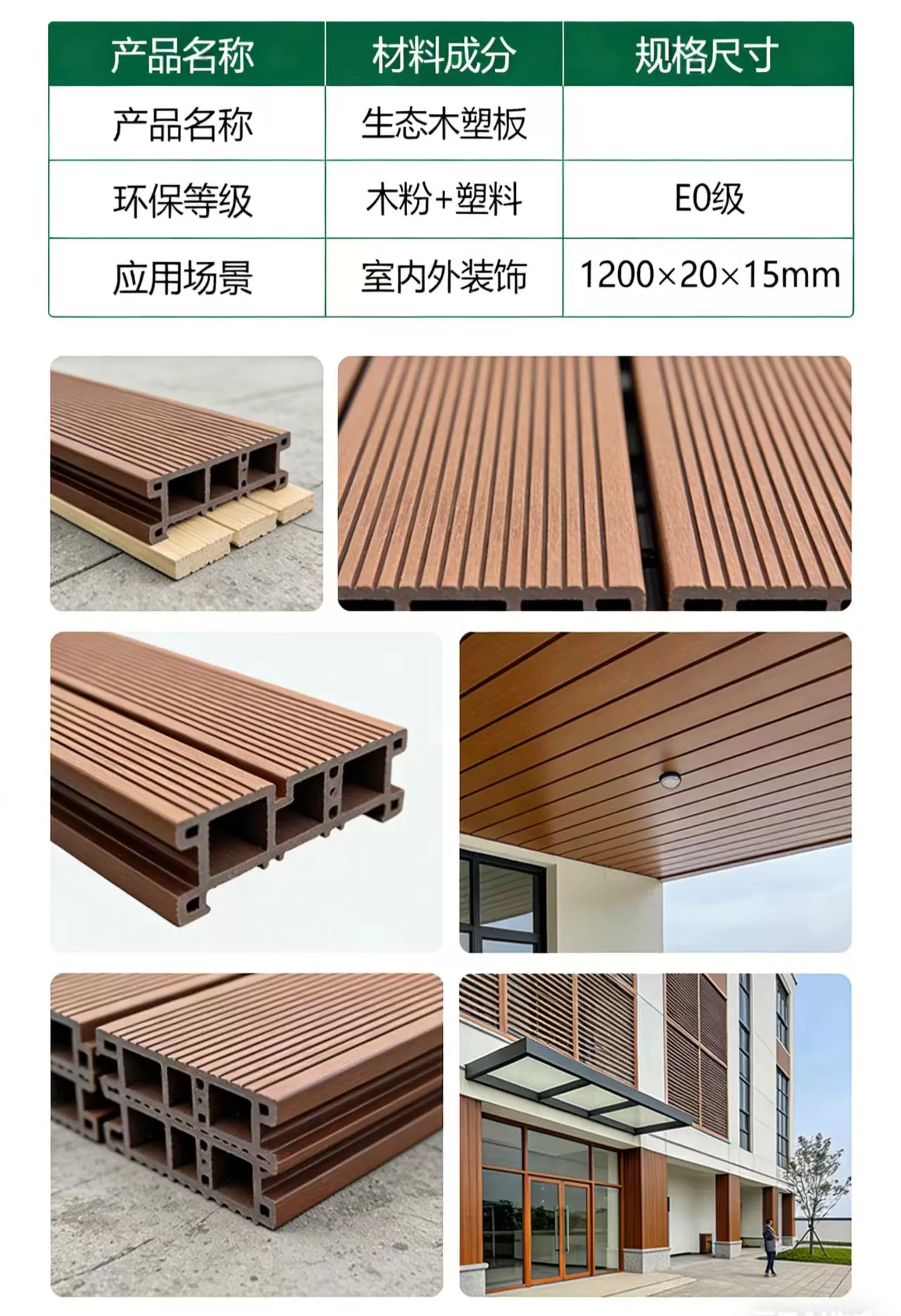 这是一款木粉 + 塑料复合的生态木塑(WPC)板材,属于 E0 级环保绿色建材,兼具木材的质感与塑料的耐候性,适用于室内外装饰、景观工程等场景。