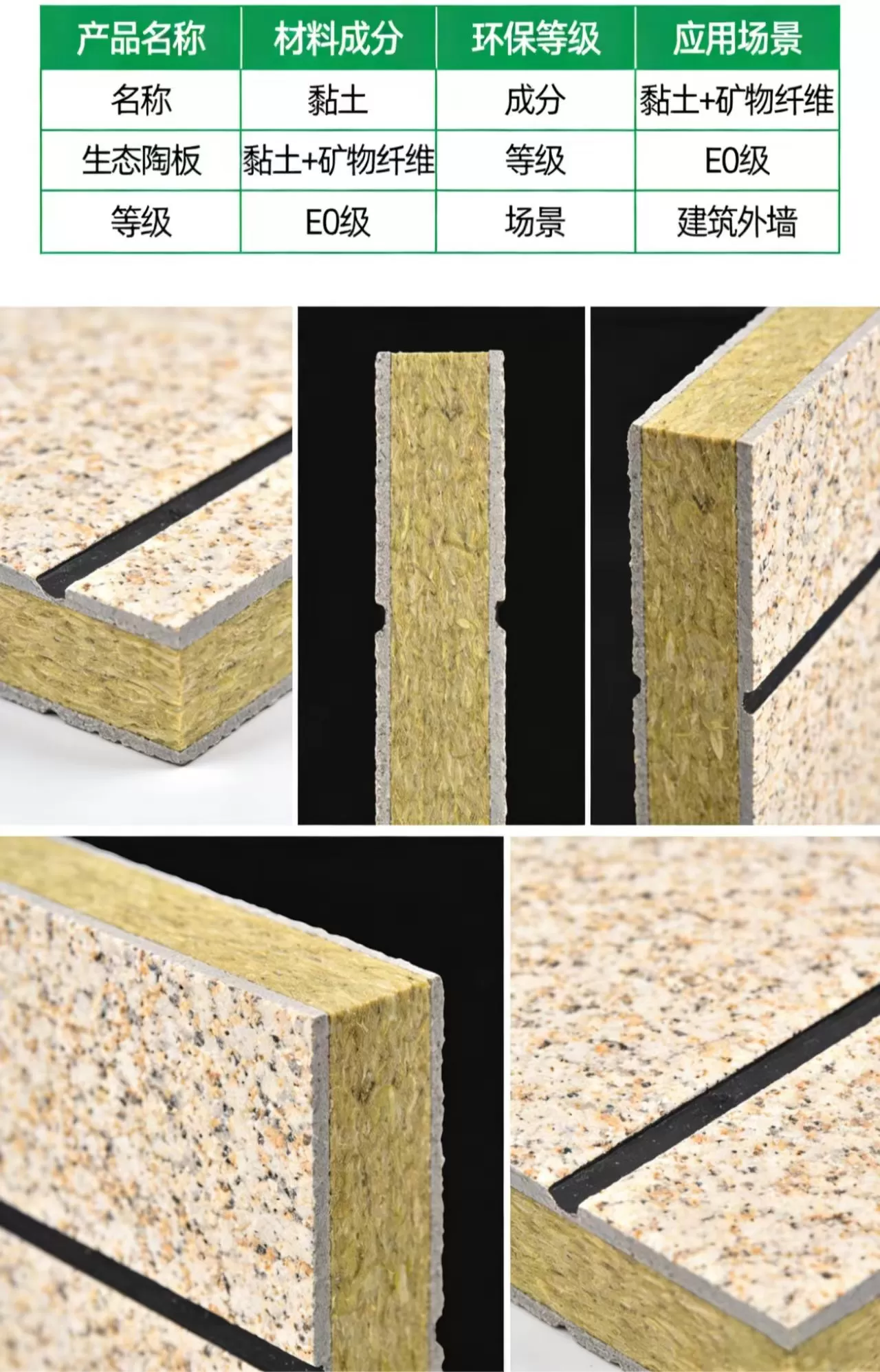 | 核心材质 | 表面层:生态陶板(黏土 + 矿物纤维),芯层:保温层(岩棉 / 矿物纤维) |