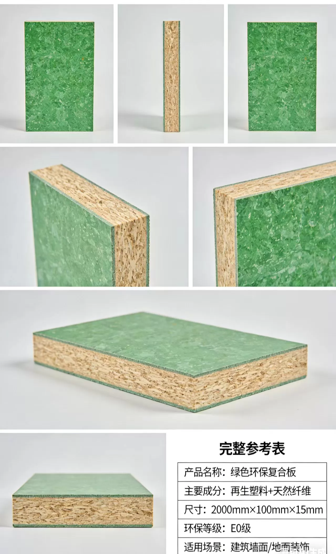 这是一款再生塑料 + 天然纤维复合的 E0 级绿色环保复合板,属于建筑装饰用高端防潮板材,集环保、防潮、高强、易加工于一体,是墙面 / 地面装饰、全屋定制的理想绿色建材。