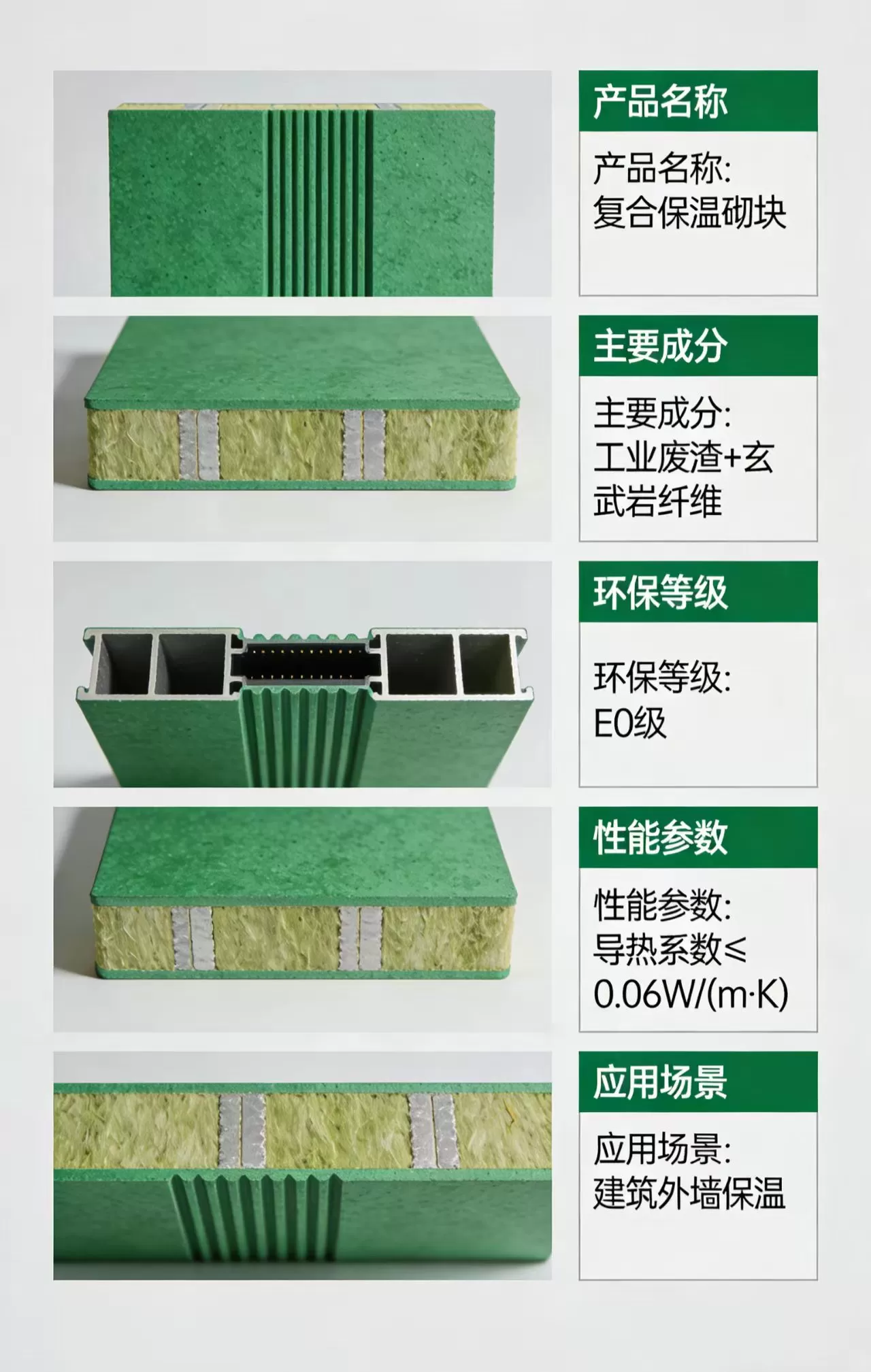 是一款工业废渣 + 玄武岩纤维复合的 E0 级绿色环保复合保温砌块,集结构承重、保温隔热、防火装饰于一体,是建筑外墙保温的高端节能绿色建材,完全适配建筑节能与消防规范要求。