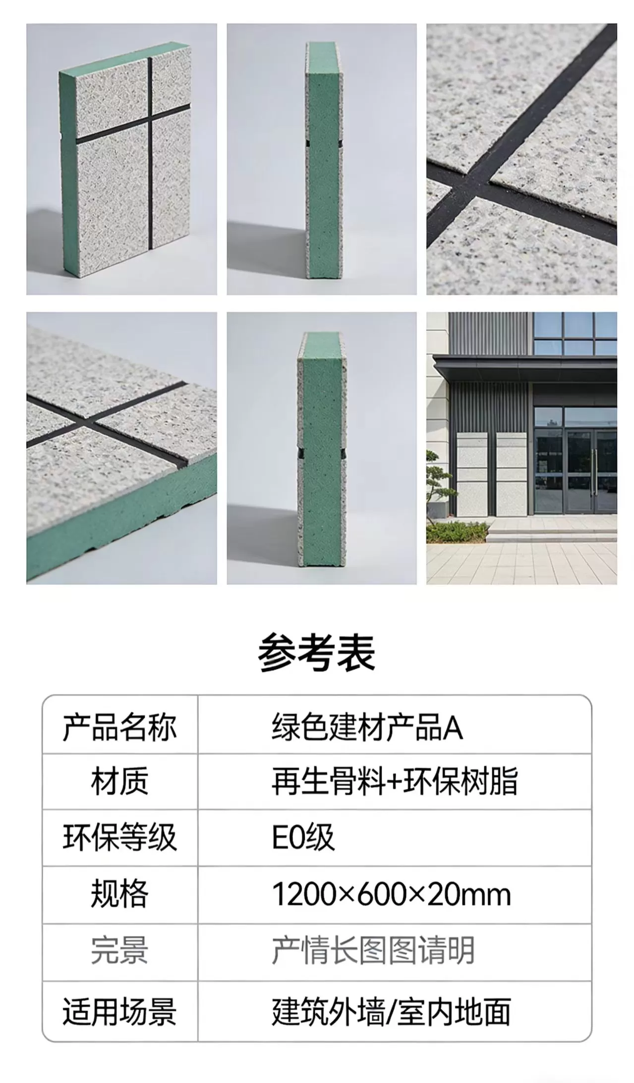 这是一款再生骨料 + 环保树脂复合的 E0 级绿色建材,集仿石装饰、结构承重、环保节能于一体,是建筑外墙、室内地面的高端装饰用绿色建材。