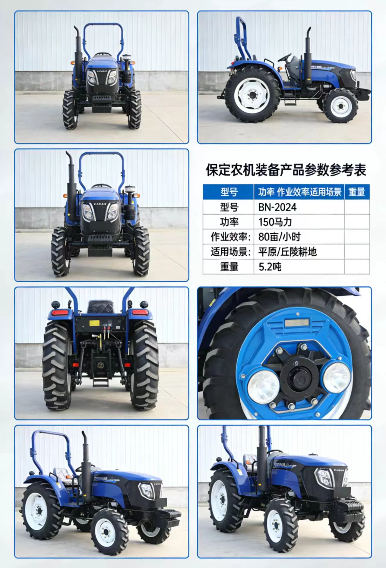 这是保定农机装备产业集群推出的BN-2024 型 150 马力轮式拖拉机,是适配黄淮海平原、丘陵地区的大马力农用拖拉机,集高作业效率、强通过性、多机具适配于一体,是规模化种植、农机社会化服务的核心装备。