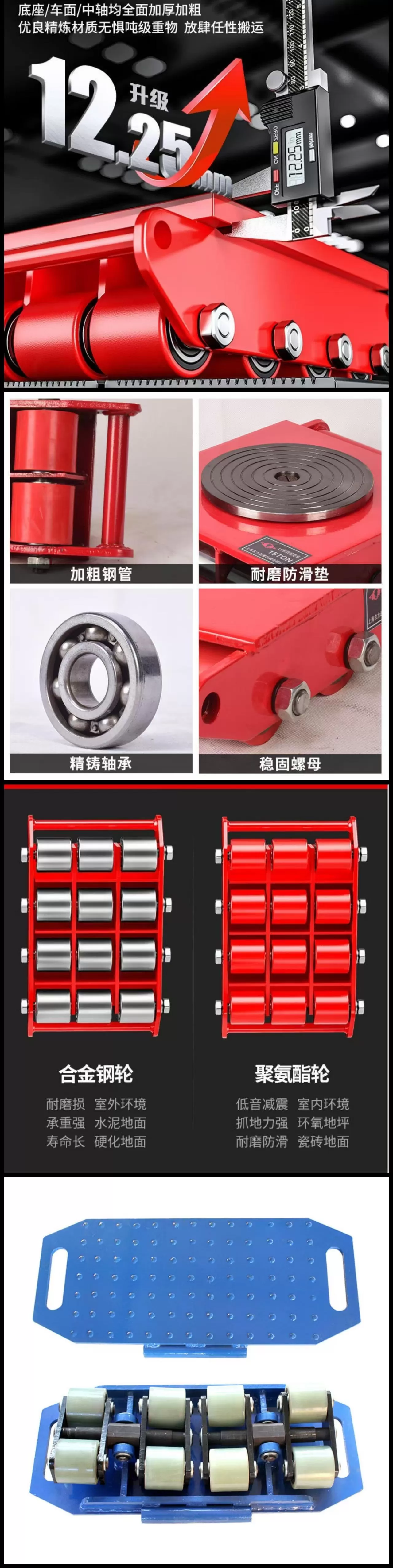 这是一款工业级重型搬运坦克车(俗称搬运小坦克 / 重物移位器),专为重型设备、机床、大型货物的短距离平移搬运设计,采用加厚钢结构 + 多轮组承载,是工厂、工地、设备安装场景的核心省力搬运工具。