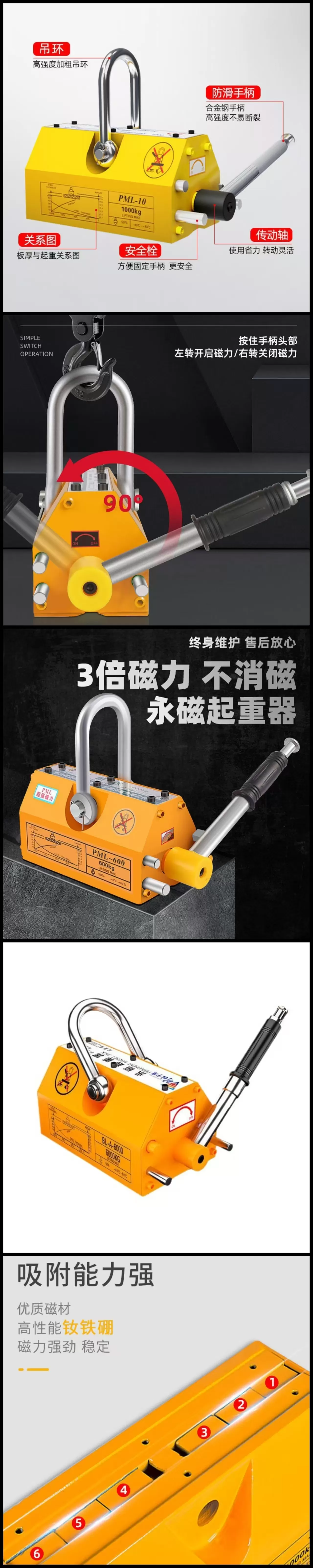 这是一款手动式永磁起重器(俗称磁力吊、永磁吸盘),专为钢铁、钢材等导磁重物的吊装搬运设计,采用钕铁硼强磁材质,无需电源即可实现安全、高效的起重作业,是工厂、钢材市场、设备安装的核心起重工具。