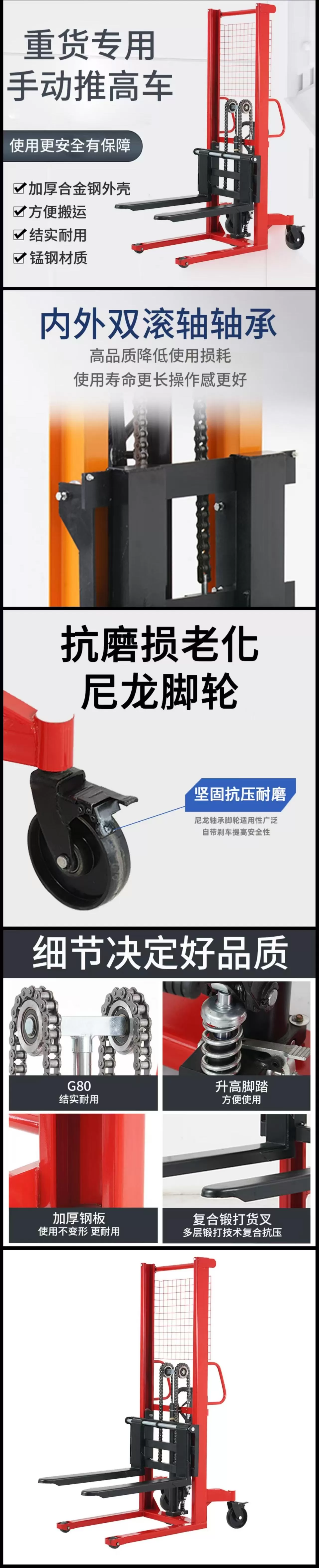 这是一款重货专用手动推高车(堆高车 / 堆垛车),专为仓储、工厂、物流的货物堆垛、装卸、搬运设计,以液压驱动实现手动升降,是托盘货物垂直搬运的核心手动设备。