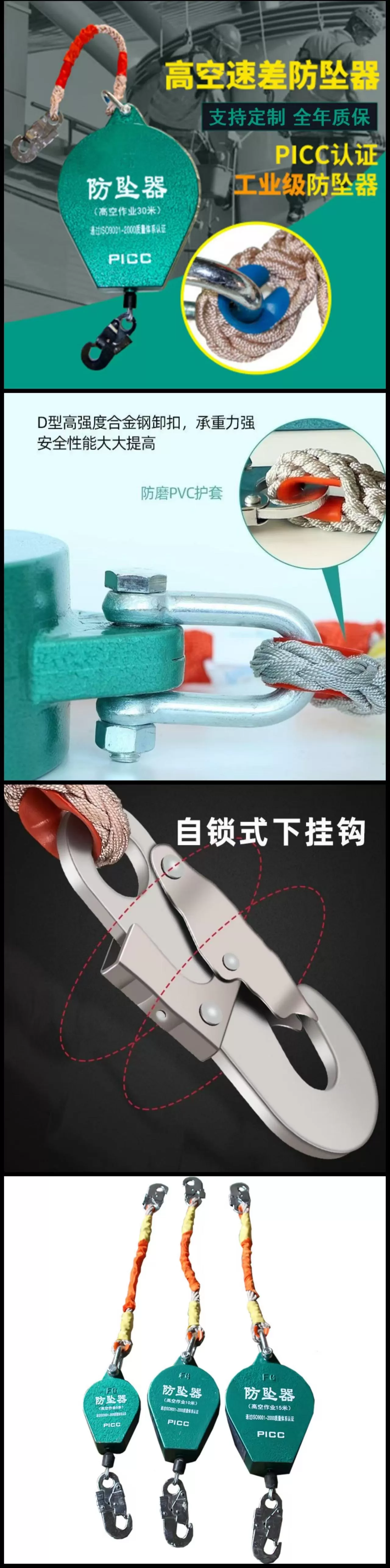 | 安全特性 | 双重自锁、坠落即刻锁止、PICC 质量承保、符合 ISO9001 认证 |
