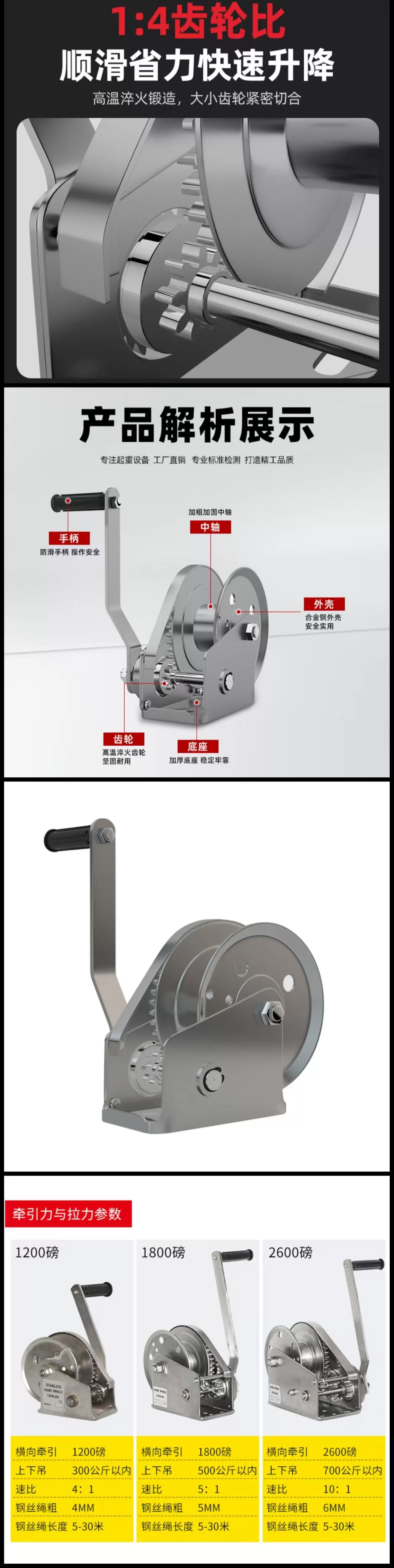 | 规格可选 | 1200 磅 / 1800 磅 / 2600 磅多吨位,对应 4/5/6mm 钢丝绳 |