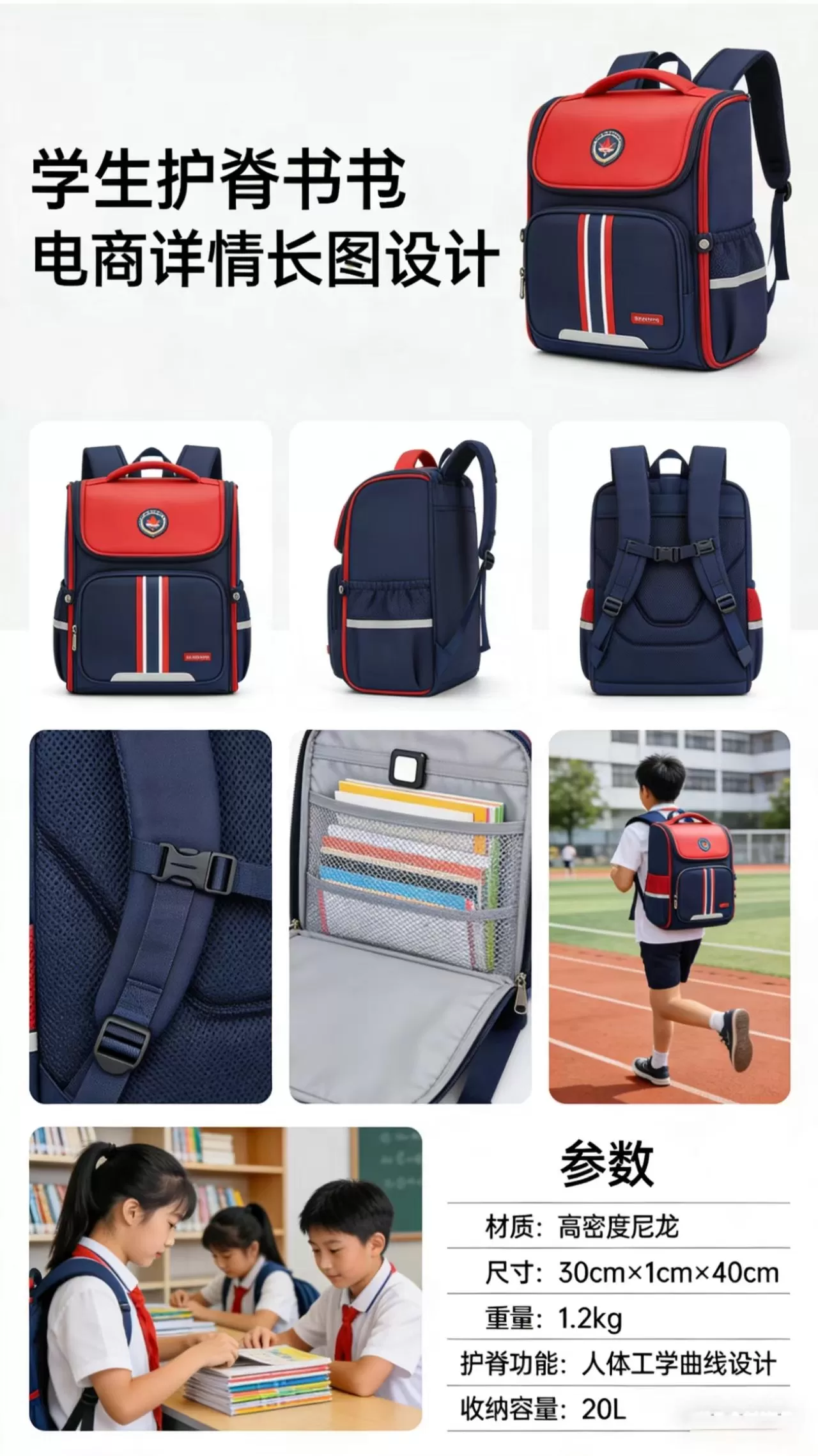 | 功能设计 | 人体工学护脊曲线、透气减压背带、多隔层分类收纳 |