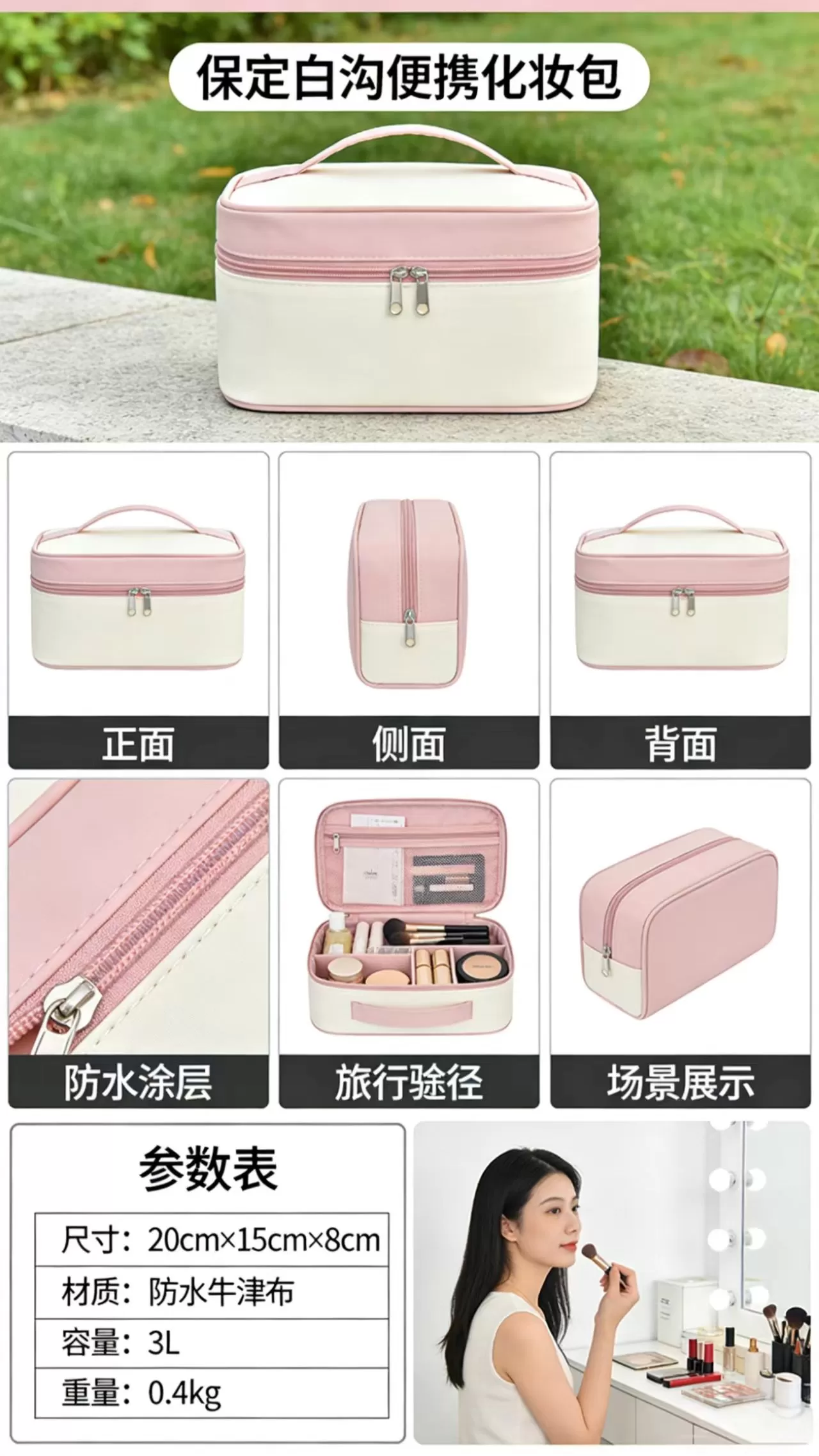 这是一款高颜值大容量便携化妆包,采用防水牛津布材质,分层收纳设计,是日常通勤、旅行出差的美妆收纳神器。