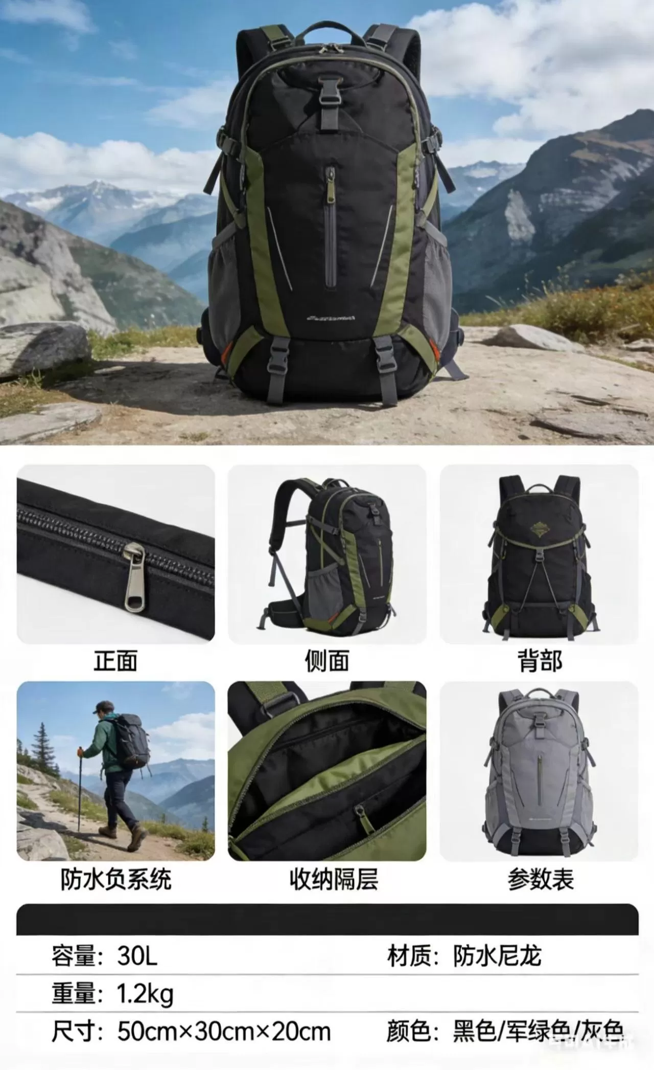 | 核心容量 | 30L(满足中短途徒步、旅行、露营装备收纳) |