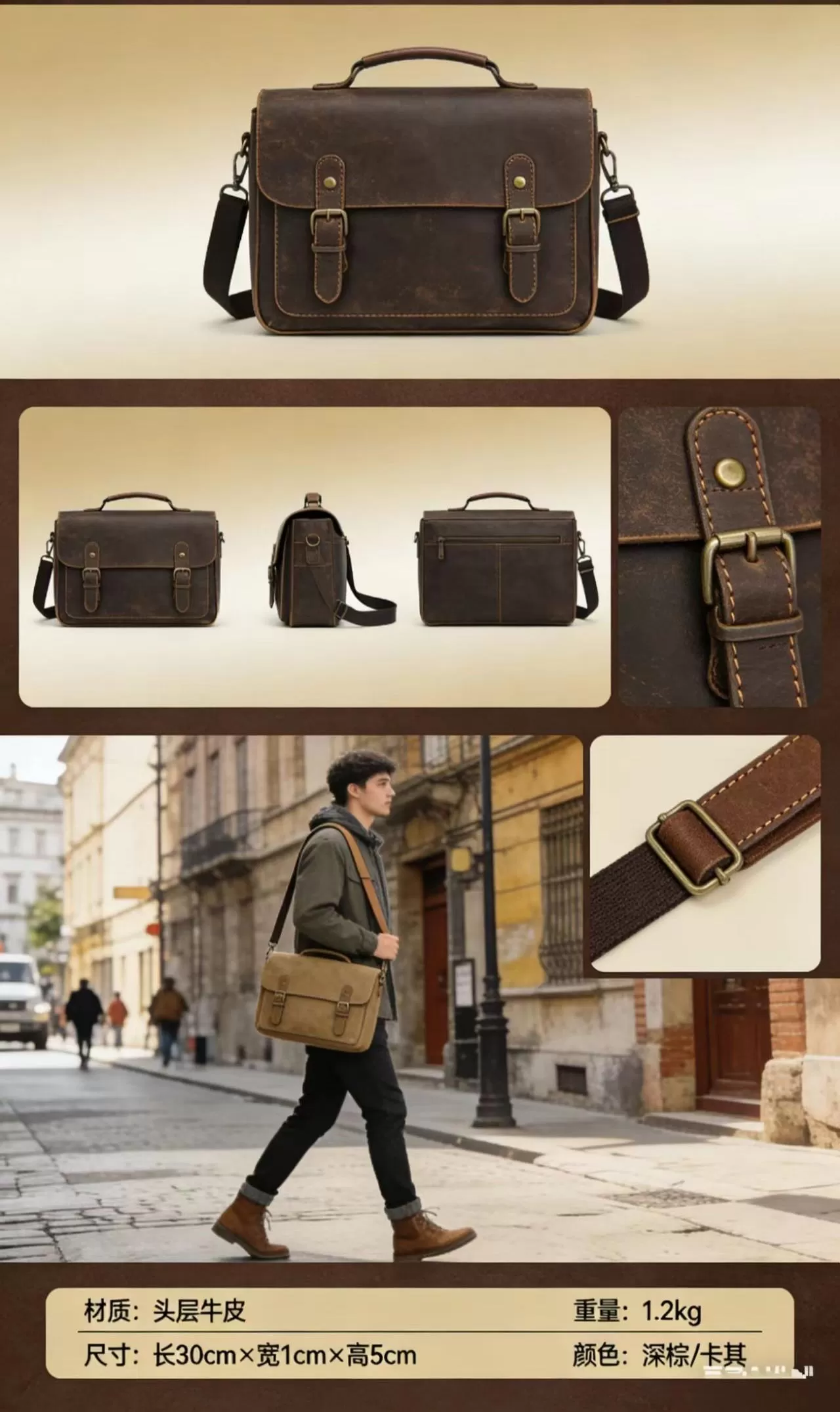 | 核心材质 | 头层牛皮(复古做旧工艺,质感细腻、耐磨抗造) |