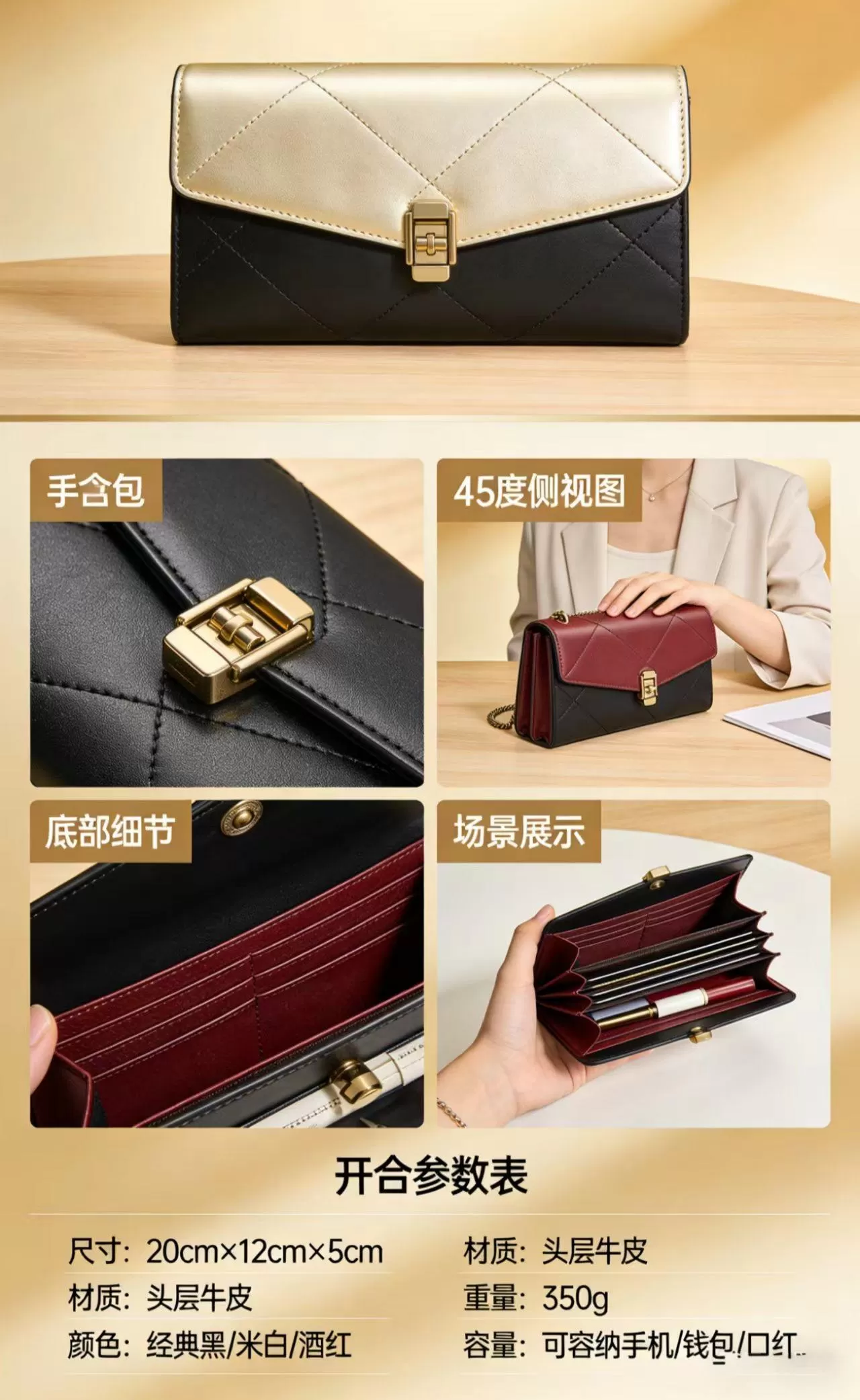 这是一款轻奢风头层牛皮女士钱包,采用菱格纹设计,多隔层大容量,兼具钱包、手拎包、斜挎包多种功能,是日常通勤、出行的精致配饰。