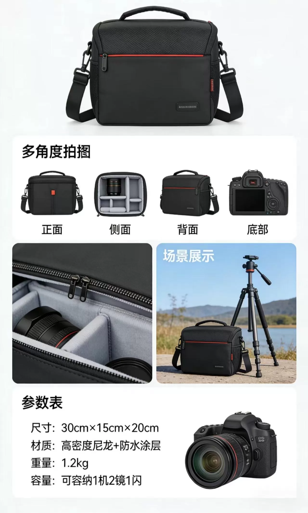 | 核心配置 | 可调节隔层、防水拉链、手提 + 斜挎双背法 |