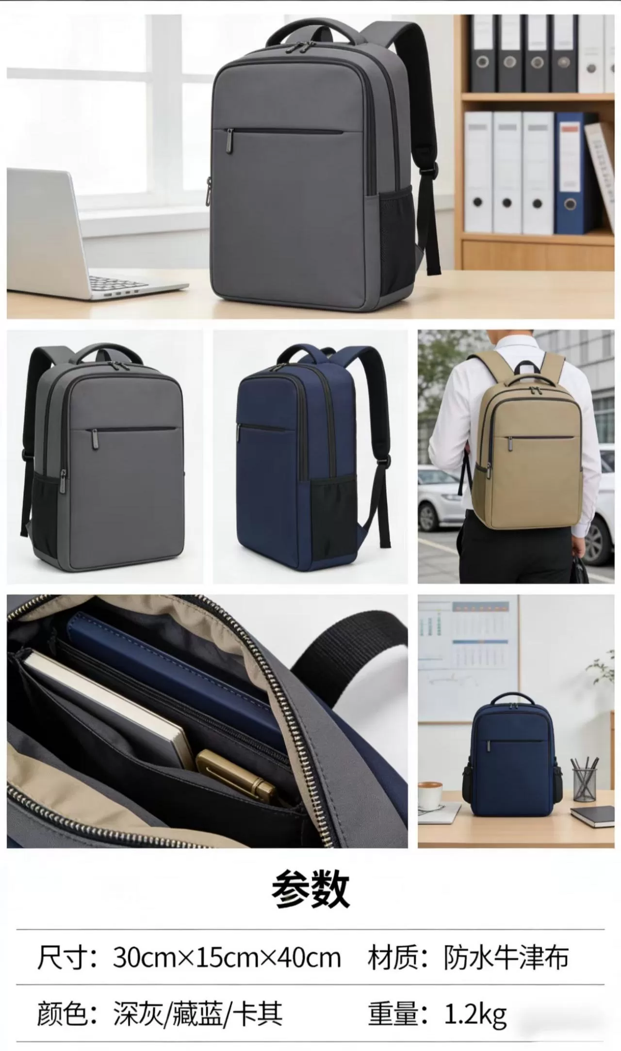 这是一款简约商务风防水双肩电脑包,采用防水牛津布材质,大容量分层设计,是职场通勤、差旅出行的实用装备。