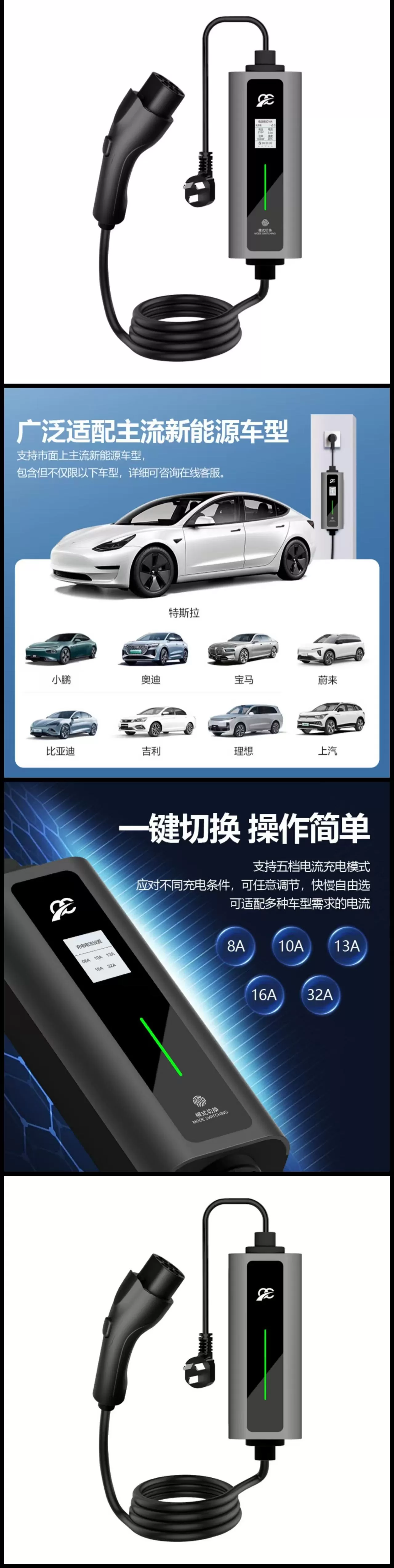 | 电流调节 | 五档可调(8A/10A/13A/16A/32A),快慢自由切换 |