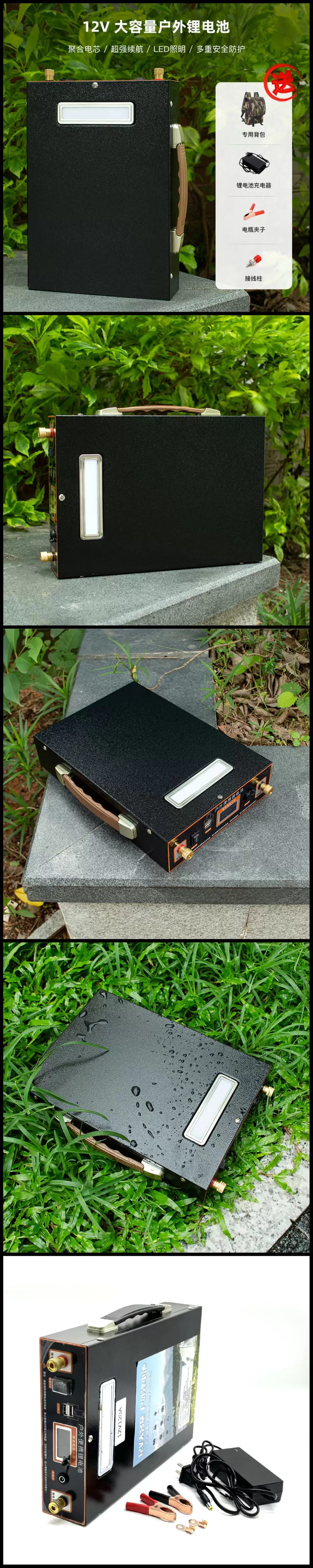 这是一款便携式 12V 户外储能锂电池,采用聚合电芯,超长续航,集成照明与多接口输出,是户外作业、车载备用、应急供电的理想电源。