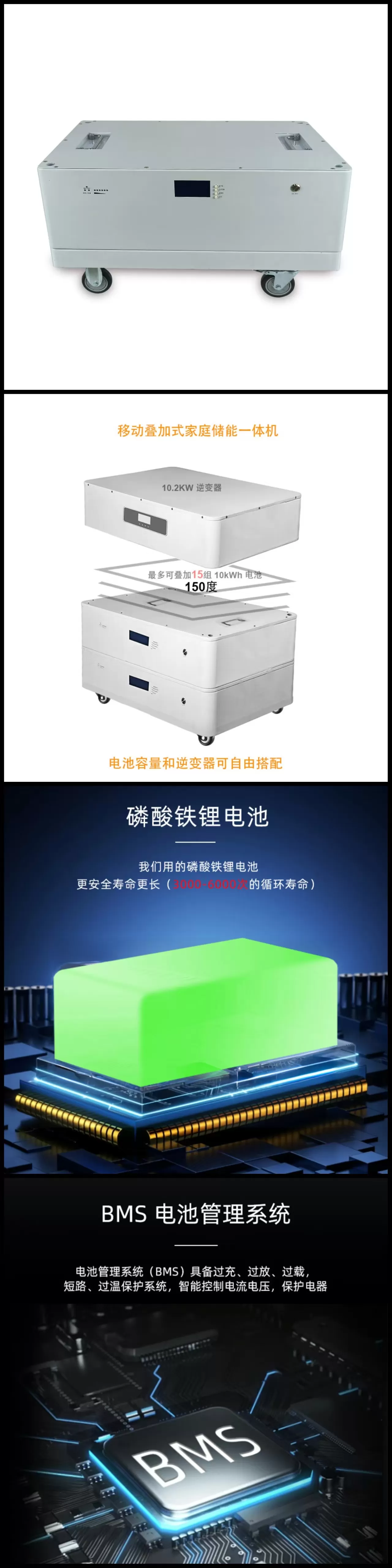 | 扩容能力 | 最多可叠加15 组10kWh 电池,总容量达150 度 |
