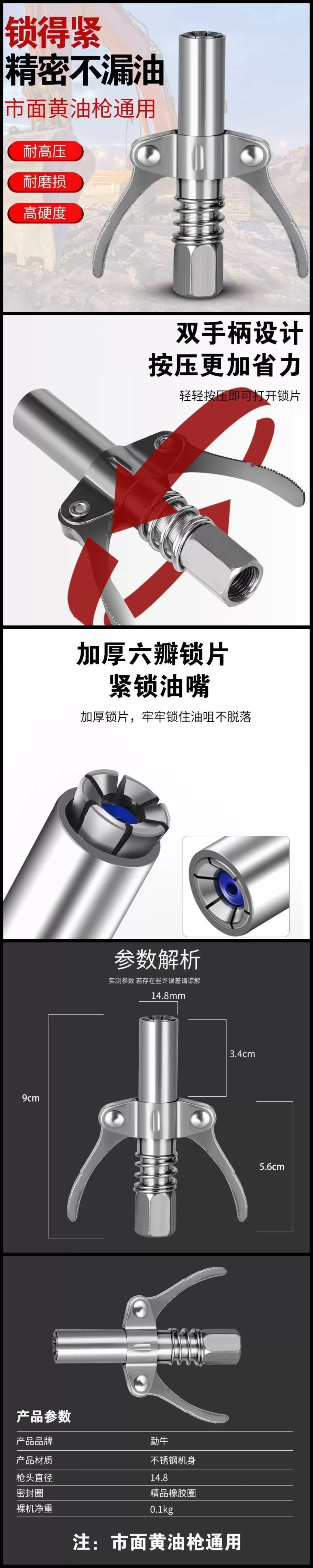 这款锁钳式黄油枪枪头是专为高效黄油加注设计的配件,采用高压密封与锁扣结构,适配市面各类黄油枪,是工程机械、汽车维修等场景的可靠润滑工具。