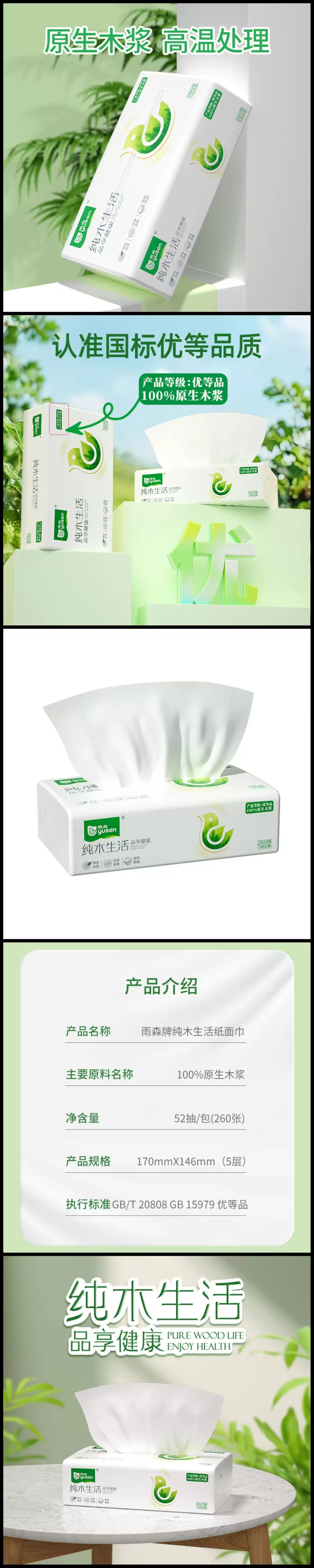 雨森纯木生活抽纸是一款采用 100% 优质原生木浆精造而成的家用抽纸。专为追求健康洁净、注重肌肤呵护与品质生活的用户设计,通过五层加厚织造与高温处理工艺,实现了柔软亲肤与强韧耐用的完美平衡。产品达到国标优等品标准,执行 GB/T 20808、GB 15979 双重标准,从原料到成品守护全家日常清洁使用安全。